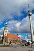 We nemen de volgende bus en rijden naar de Alexanderplatz. Ondertussen zien we al het Rotes Rathaus en de televisietoren. Hier kunnen we overstappen van de rode naar de blauwe lijn en dat doen we, zodat we uitkomen bij de East Side Gallery. Hier lopen we een uur rond, kijkend naar de kunst op de Muur, de Oberbaumbrucke en genieten van een Kaffee und kuchen.