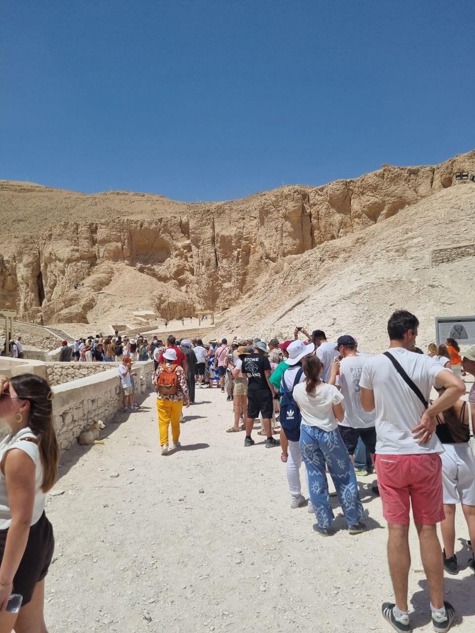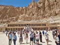 In de Vallei der Koningen bezoeken we 3 tombes die onder de grond liggen. Ze zijn erg goed bewaard gebleven en daardoor zijn de kleuren nog goed zichtbaar. Dan naar de Tempel van Hatsjepsoet. Bij beide bezienswaardigheden schrikken we van de hoeveelheid bussen en mensen. Op alle andere plekken was het vrij rustig, maar dit is ook als excursie vanuit Hurghada te doen. Genoeg gezien en het is warm vandaag!