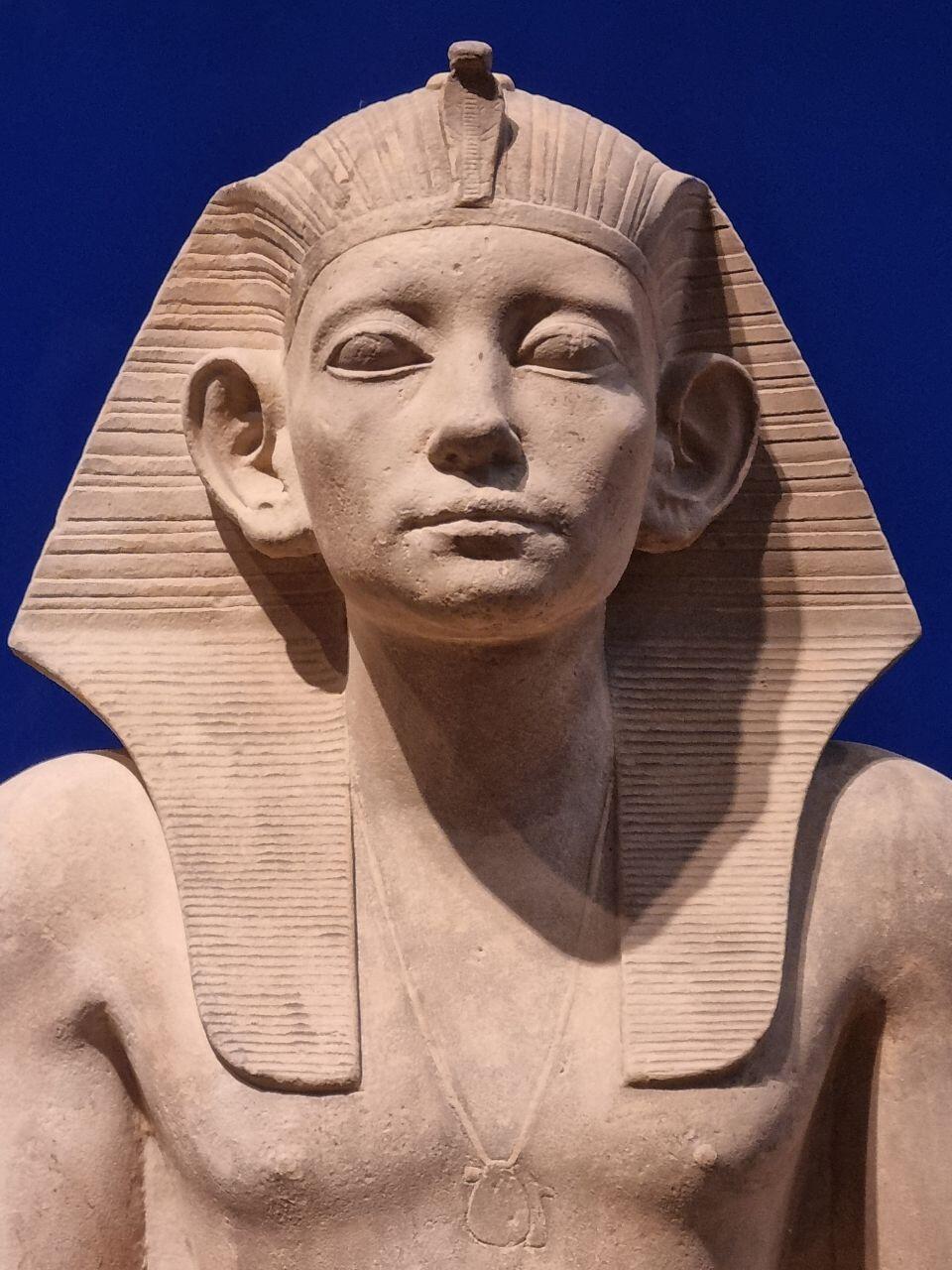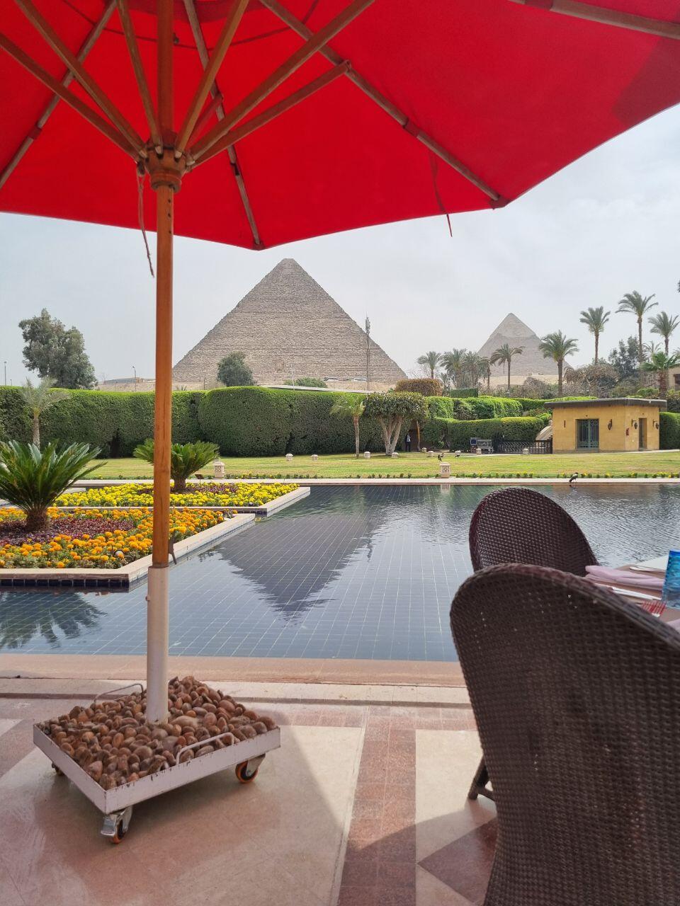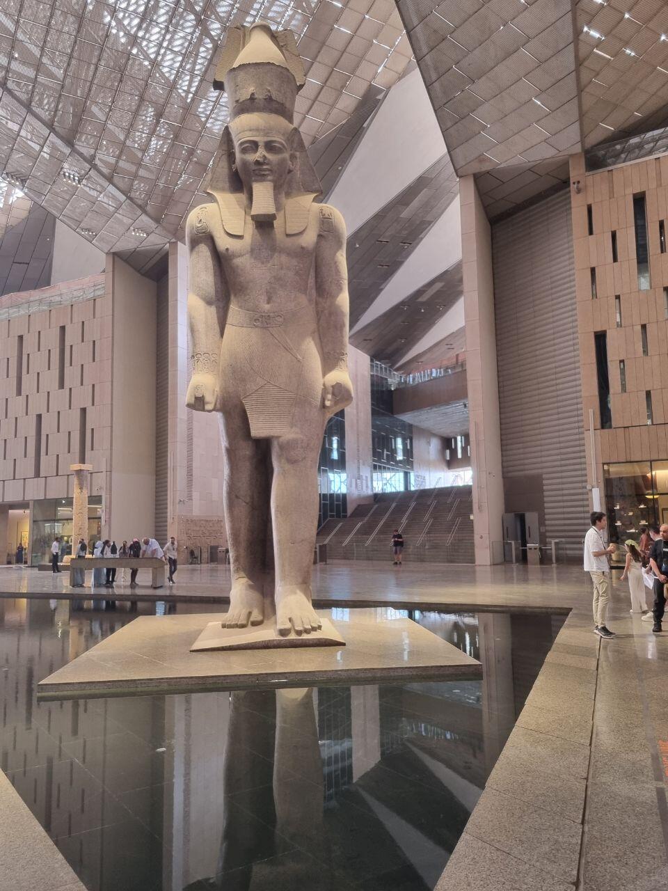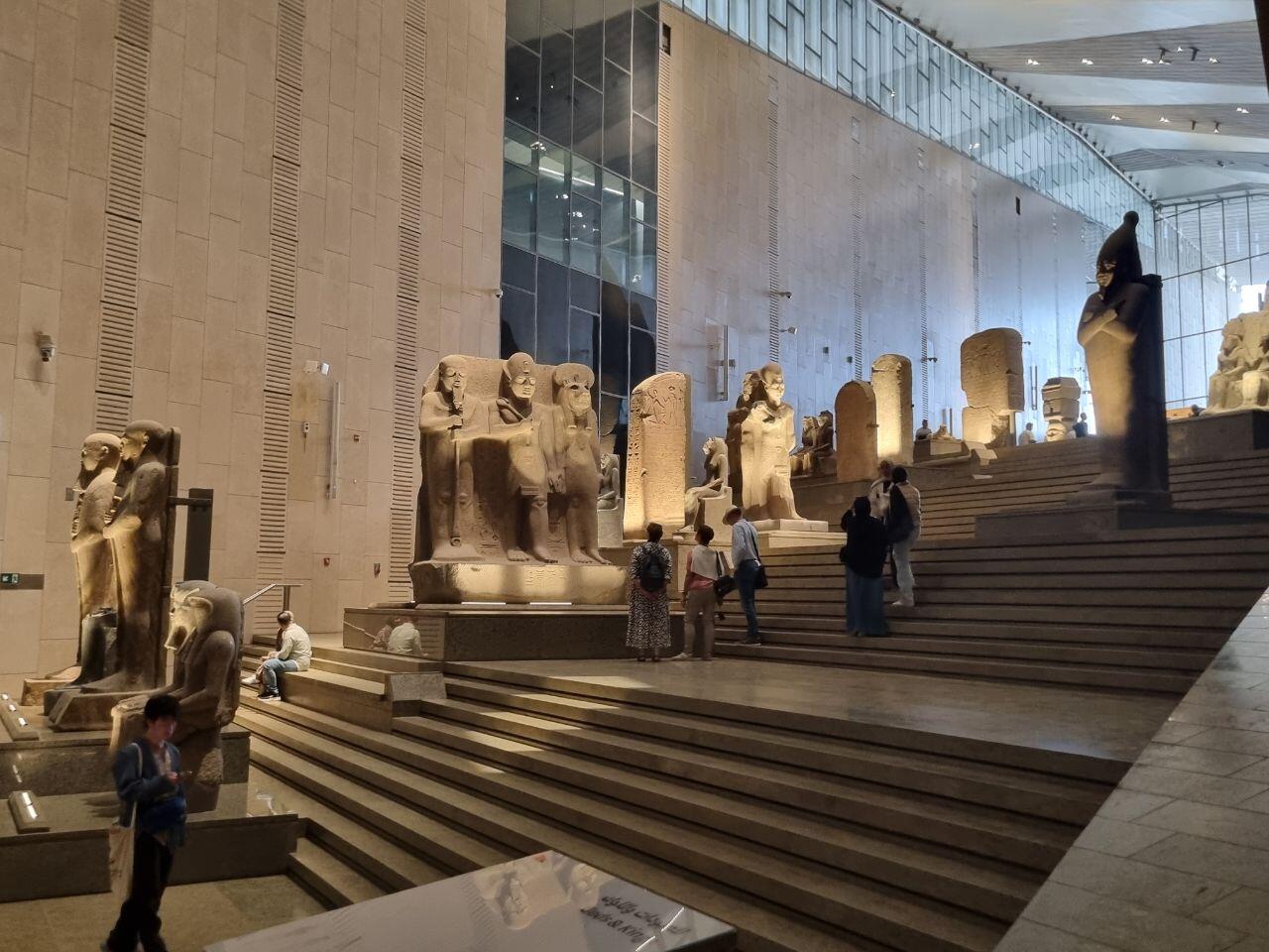 Laatste stop op dit terrein is de Sphinx die er heel stoer bij ligt voor de piramides. We lunchen bij het Marriott Mena House met uitzicht op de piramides. In de middag staat de GEM (Grand Egyptian Museum) op de planning. Wat een groot en machtig gebouw! Juli 2024 in gebruik genomen en dus nog splinternieuw. Ook al heb ik zeer weinig met musea, dit is toch een om even doorheen te lopen. De hele Egyptische oudheid, inclusief mummies, komt hier voorbij.